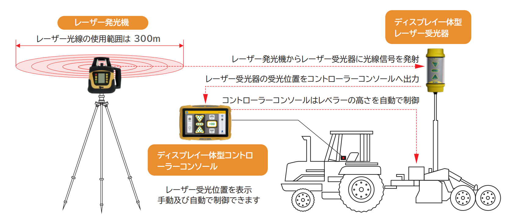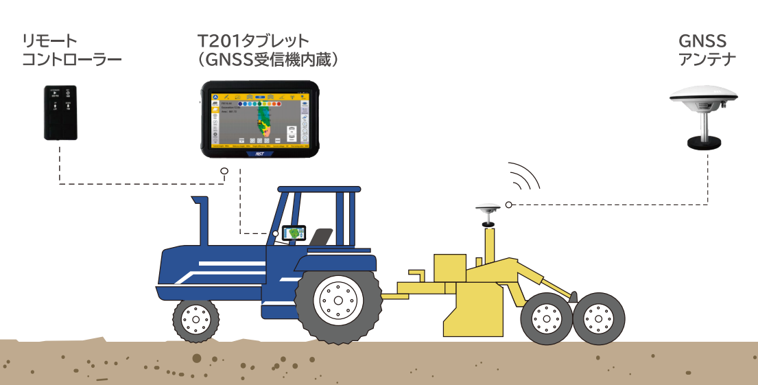 電波データの利用でレーザー光の混線干渉と作業範囲の問題も解消できます。(作業精度±2〜3cm)