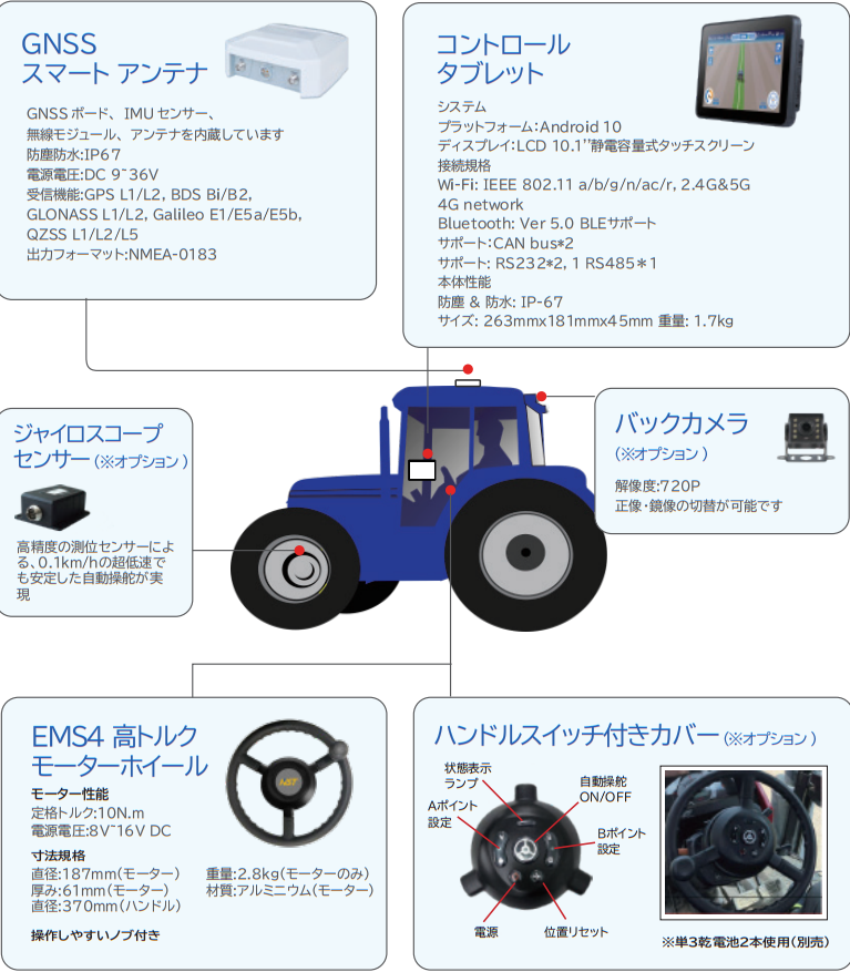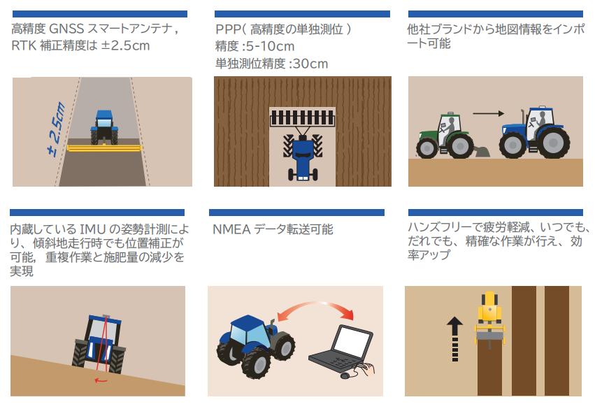 ・幅広い機械互換性(トラクター、ハーベスター、田植え機、種まき機等、95%以上の機械仕様に対応)国内での導入サポートと保守対応。