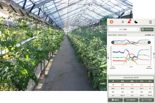また、データを振り返ることもでき、モニタリングのデータを参考にしながら、環境制御装置の設定を変更することができます。 -